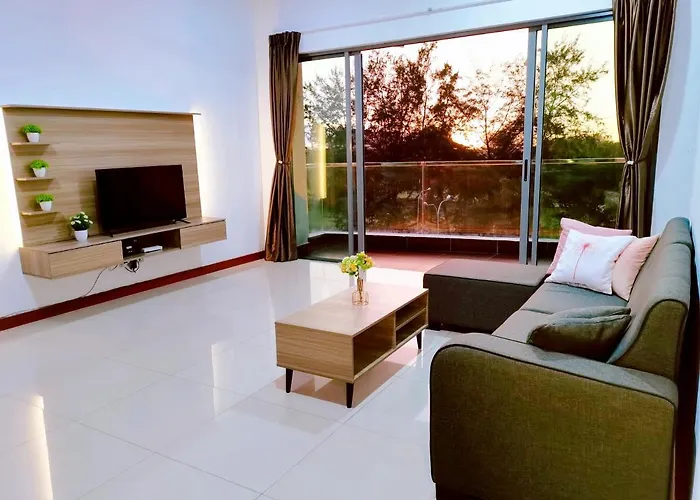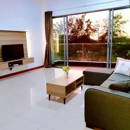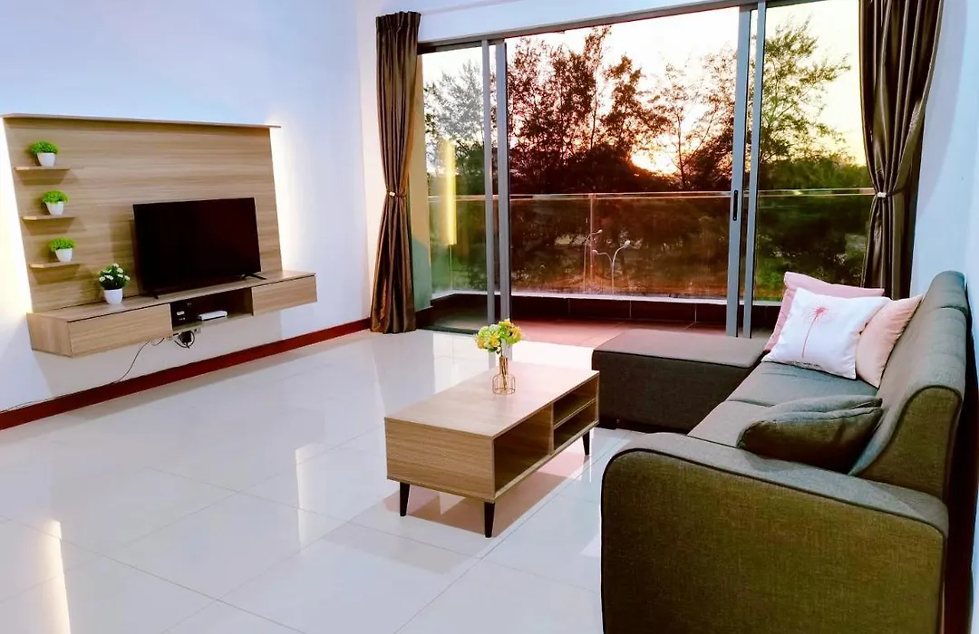 Unit penginapan dilengkapi dengan balkoni, sofa dan ruang duduk serta dapur lengkap.